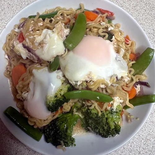 Two packs of noodles stir-fried with colourful mixed vegetables. Light, healthy, crunchy—perfect meat-free morning fix.
